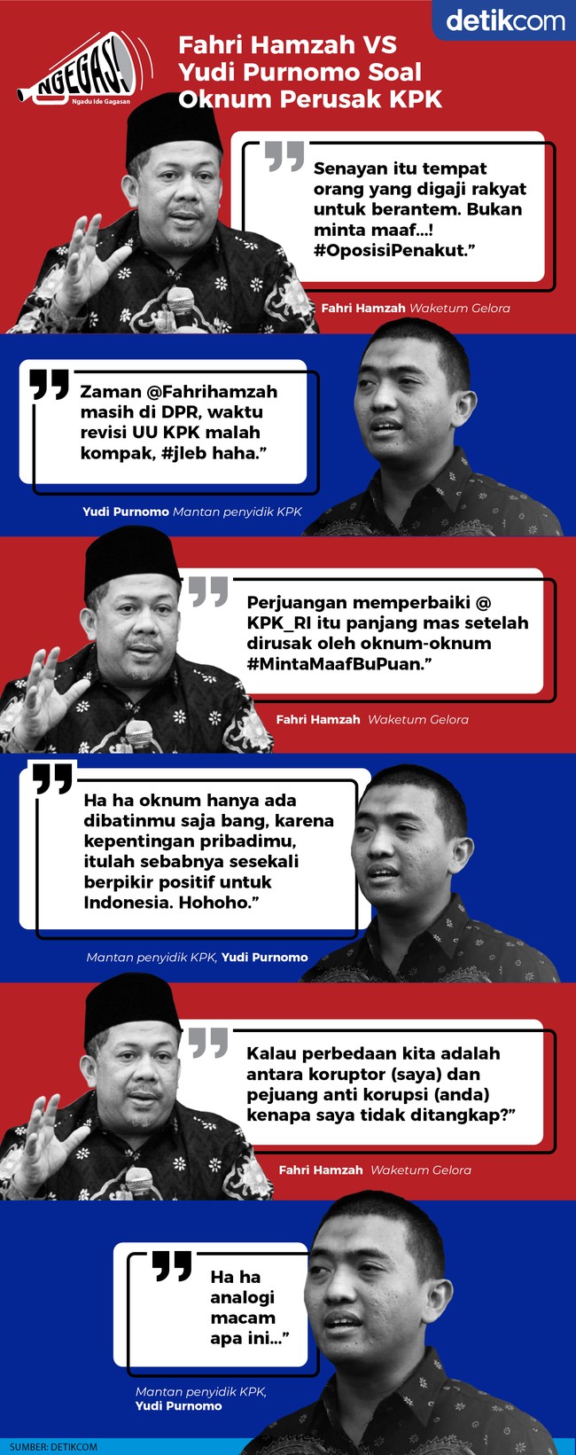 Waketum Gelora Fahri Hamzah dan Mantan penyidik KPK, Yudi Purnomo kembali beradu pendapat. Kali ini soal oknum perusak KPK. Kalian dukung siapa?
