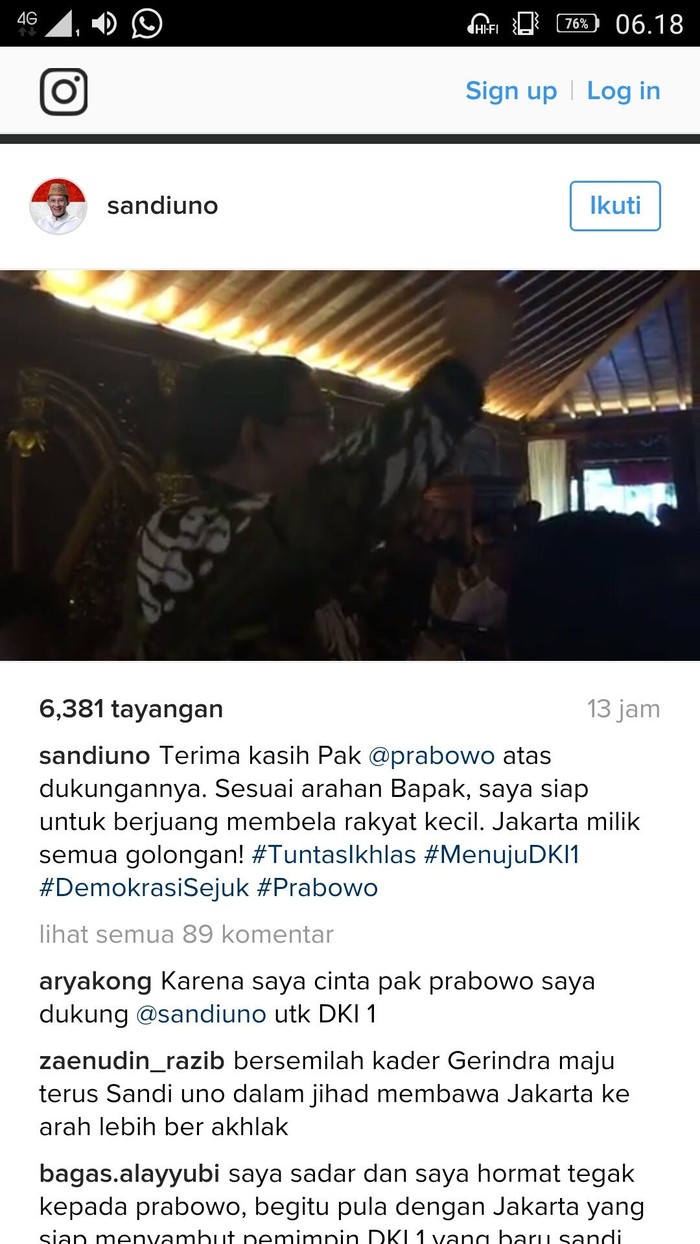 Terdapat video dalam postingan Sandiaga tersebut. Video itu menampilkan Prabowo yang meminta semua pendukungnya untuk membantu Sandiaga.