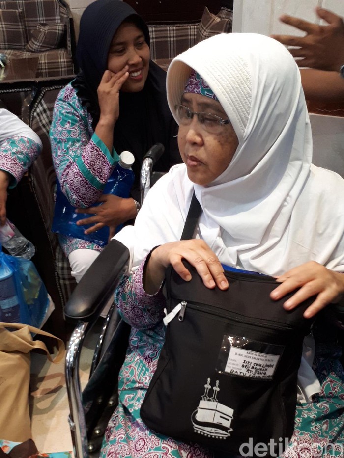 Siti sakit di bagian mata sejak 30 tahun lalu. Dia tidak lagi bisa melihat. Namun kekurangan itu tak menyurutkan semangatnya berhaji. Mendaftar pada 2010, mereka berangkat haji tahun ini.