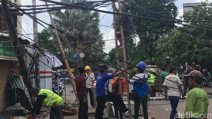 "Jadi pohon jatuhnya ke arah kanan kios. Karena angin besar langsung ambruk nimpa kabel listrik sama Telkom. 3 tiang ikut jatuh karena kabel ketarik pohon," lanjutnya.