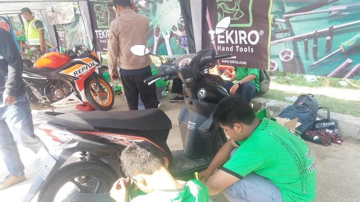 Wakil Kepala Polda Metro Jaya Brigjen Purwadi datang dan berkeliling ke beberapa lokasi stan. Dia pun berbincang dengan buruh yang sedang ganti oli.