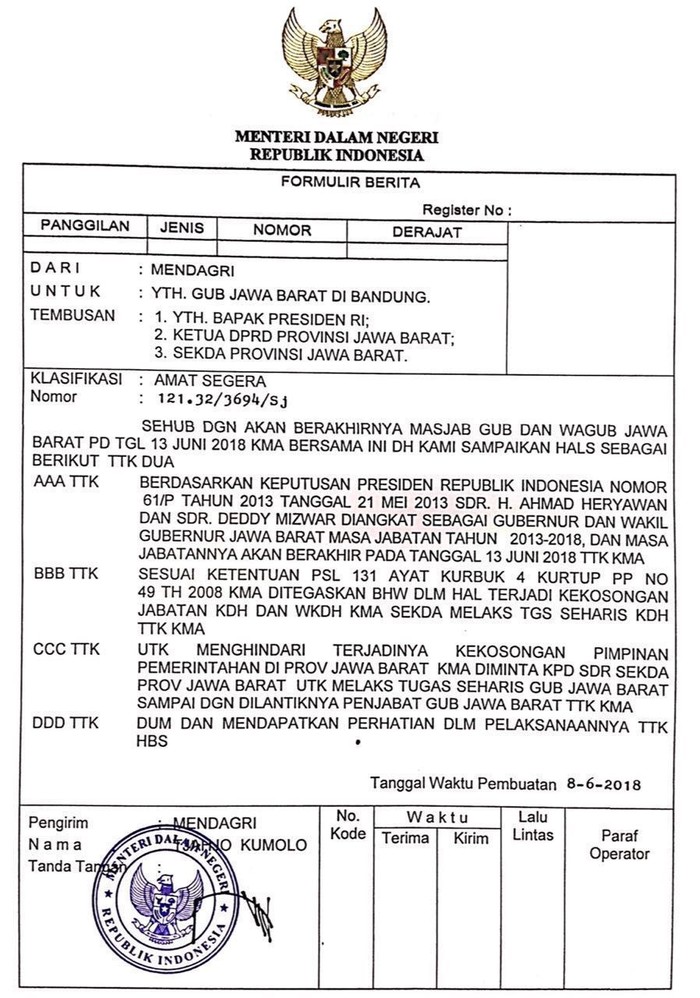 Keputusan menunjuk Iwa sebagai Pj Gubernur Jabar tertuang dalam surat bernomor 121.32/3694/Sj. Surat tersebut diteken Tjahjo per tanggal 8 Juni.