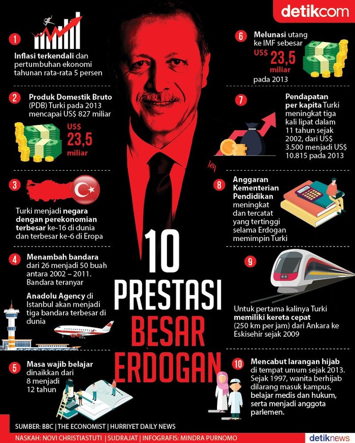 Jakarta - Selama 15 tahun memimpin Turki, Presiden Recep Tayyip Erdogan memiliki pencapaian yang tidak bisa dianggap remeh, baik di bidang ekonomi, infrastruktur, dan politik.