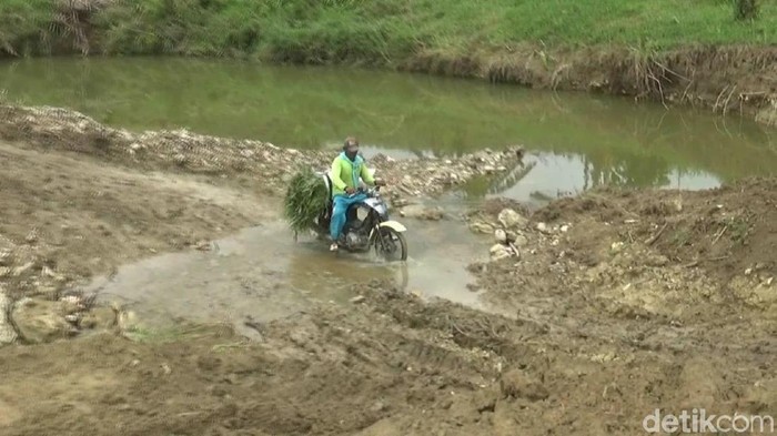 Dari pantauan detikcom, warga terpaksa menyusuri sungai untuk beraktivitas, meski jalan yang dilalui becek dan rusak parah.