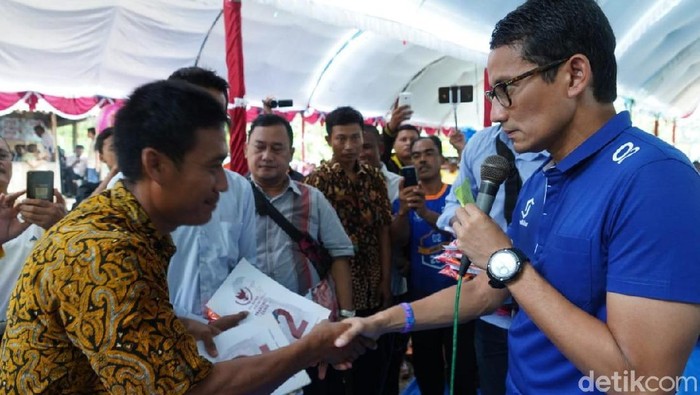 Sandi juga memberikan buku visi misi Prabowo Sandi pada pewakilan desa. Sandi juga menyampaikan jika pihaknya fokus pada ekonomi dan harga bahan pokok agar terjangkau serta penyediaan lapangan kerja.