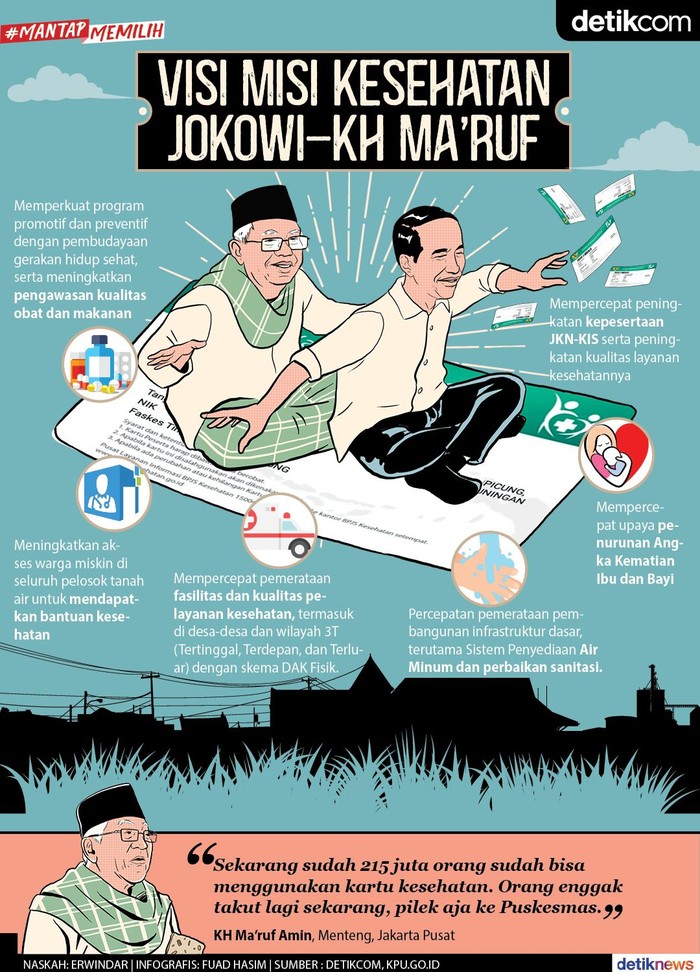 Pasangan Capres-Cawapres nomor 01 Jokowi - KH Ma'ruf Amin berjanji akan mengembangkan reformasi sistem kesehatan. Menurut mereka setiap manusia Indonesia harus sehat sehingga bisa mengembangkan diri sesuai potensinya serta menjadi lebih produktif.