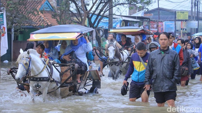 Pantauan detikcom, Rabu (10/4/2019) ketinggian air sudah sedikit menyusut dibandingkan dua hari sebelumnya. Sebelumnya ketinggian air di jalan tersebut dari betis hingga pinggang orang dewasa. Pagi ini, ketinggian air dari betis hingga lutut orang dewasa.