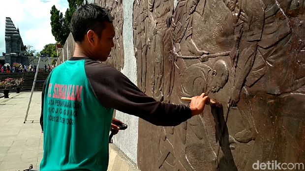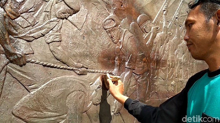 "Relief ini kan dari perunggu. Jadi perawatan warnanya kalau sudah kusam ya memang hanya pakai semir sepatu. Tapi sebelumnya, kita pulas dulu seluruh permukaan perunggu itu memakai air keras," bebernya.