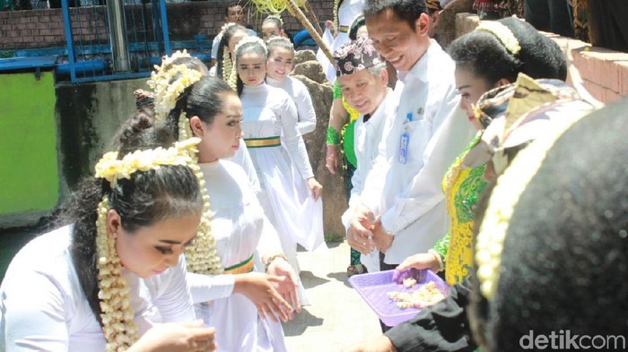 Mereka berjalan dengan santun menjalani prosesi siraman. Mulai dengan membasuh wajah, kaki dan tangan. Siraman dilakukan oleh sesepuh seni budaya di Kabupaten Tuban.