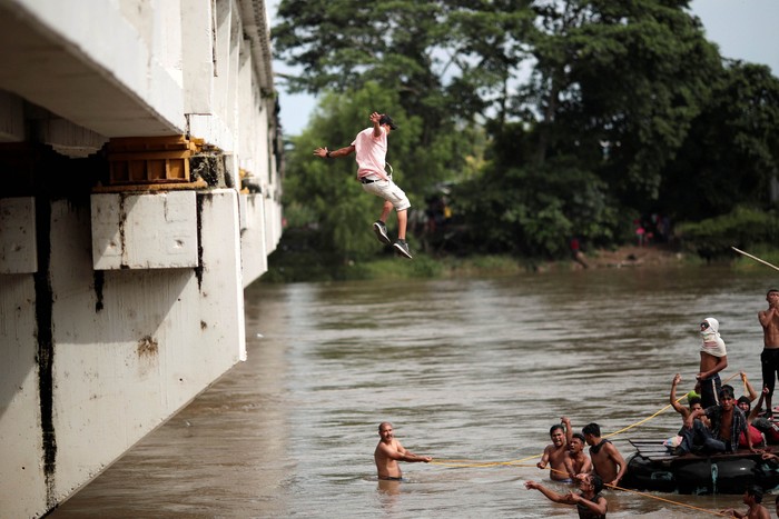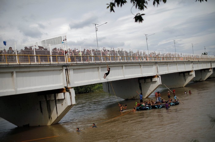 Ada yang nekat terjun ke sungai untuk dapat masuk ke perbatasan. REUTERS/Ueslei Marcelino.