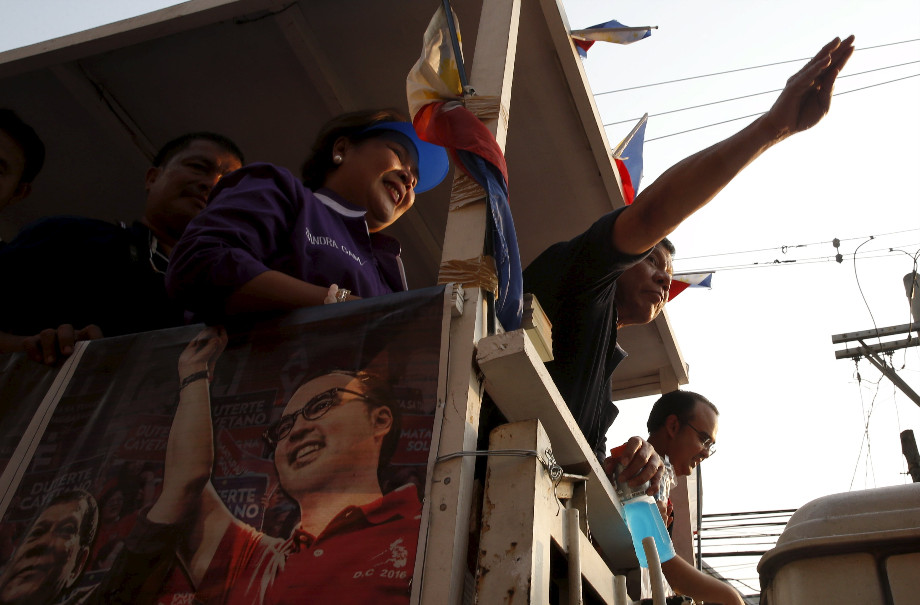 Rodrigo Duterte memberikan salam kepada pendukungnya di Malabon, Filipina, pada April 2016.