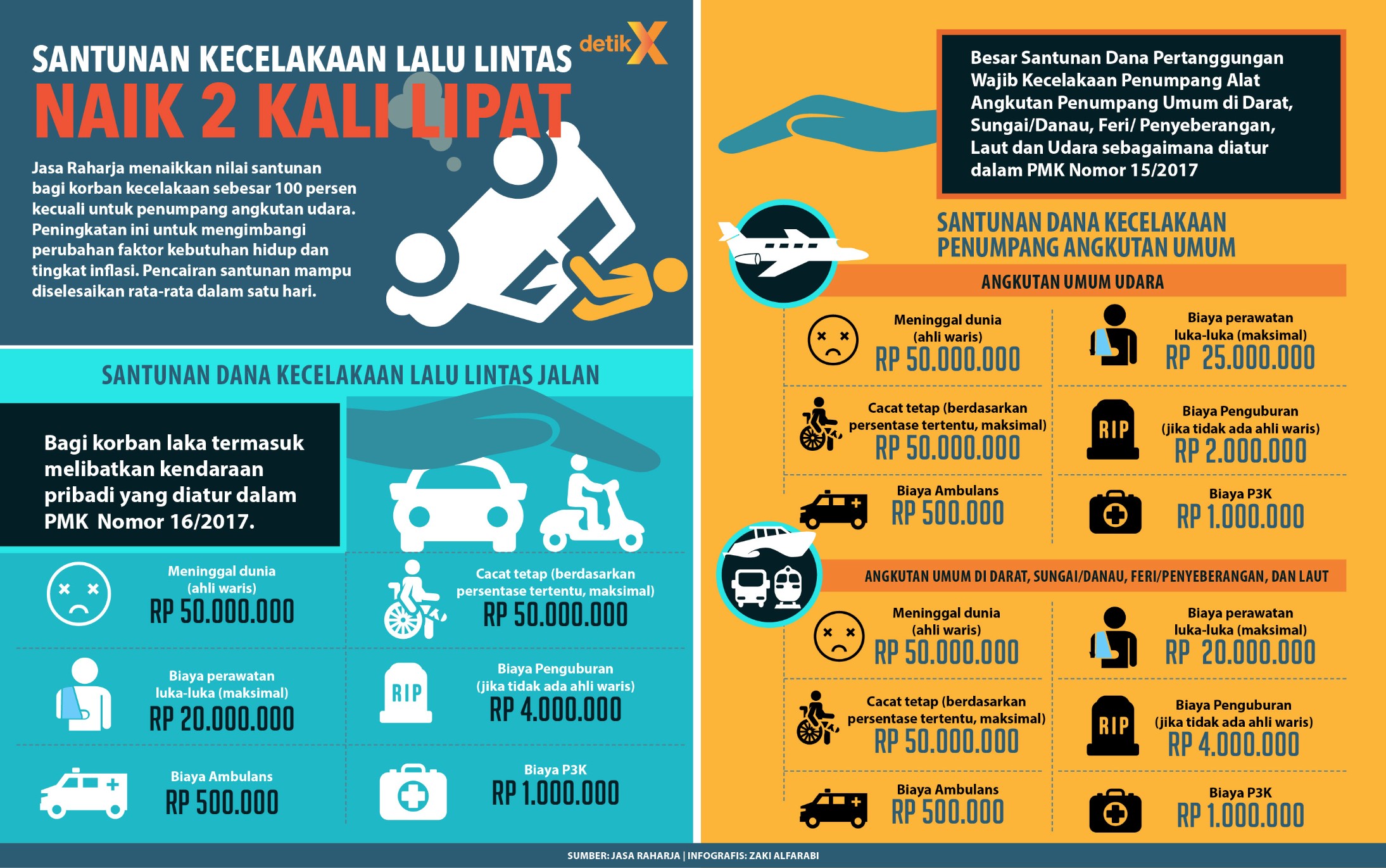 Tahun ini Jasa Raharja memperbesar nilai santunan korban kecelakaan hingga 100 persen. Direktur Utama PT Jasa Raharja Budi Setyarso memastikan kenaikan itu tidak diikuti dengan peningkatan besaran iuran wajib maupun sumbangan wajib. Pasalnya, volume kendaraan bermotor yang membayar sumbangan turut menanjak. Kenaikan santunan ini berlaku efektif 1 Juni 2017.